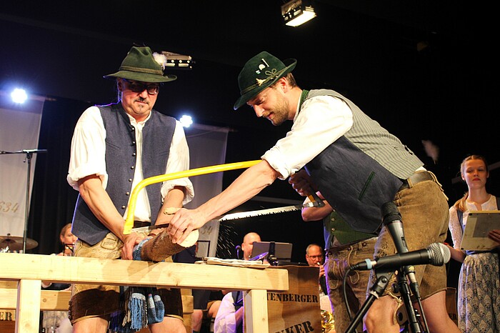 Zwischendurch ehrte Bruder Barnabas den ehemaligen Bauhofleiter Helmut Hodolitsch als Geretsrieder Original – eine Auszeichnung, die in den Jahren zuvor „Bäcker-Oma“ Anna Schmid, Edi Hien, Erich Fischer, Marlies Effenberger, Jochen Sternkopf und Rudi Utzinger erhalten hatten. Mit Schmähreden zur Tiefgarage unter dem Karl-Lederer-Platz und langwierigen Wolfratshauser Parkhausplänen endete die Fastenpredigt. Danach durften die Besucher beim Pfundsägen Muskelkraft und Schätzvermögen unter Beweis stellen. Den Abend beschlossen die fetzigen Schlager- und Rocksongs der Gartenberger Bunkerblasmusik, in der zwischenzeitlich der Münsinger Bürgermeister Michael Grasl an der Tuba und Landrat Josef Niedermaier an der Klarinette aushalfen. So endete das süffige Vergnügen erst gegen Mitternacht.