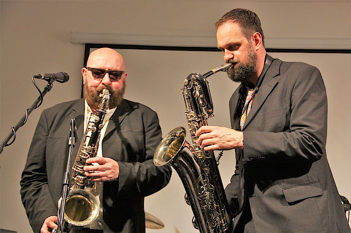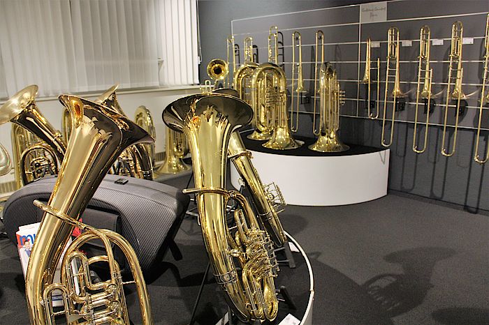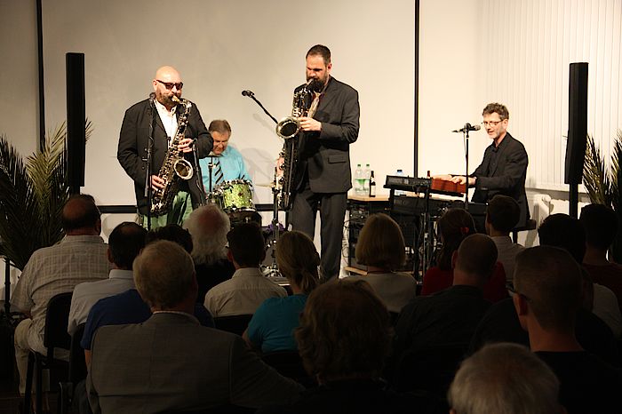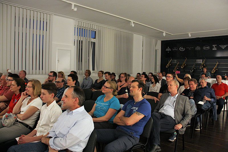 Geretsried, 26.4.2018 – In einem unscheinbaren Industriegebäude, in einer kleinen Stichstraße in Geretsried, werden Blechblasinstrumente auf Weltniveau gebaut. Deshalb kommen regelmäßig Spitzenmusiker vorbei. Man kennt sich schon lange und gut. Andreas Gafke, Sales & Marketing Director der Buffet Crampon Deutschland GmbH, zu der heute die Wenzel Meinl GmbH gehört, möchte künftig im neuen Showroom regelmäßig Workshops für Musiker und Konzerte für die Allgemeinheit anbieten, bei freiem Eintritt. Weltklassesaxofonist Albie Donnelly und einer der besten Schlagzeuger der R&B-Szene Pete York gaben sich kürzlich die Ehre. Mit dabei Horst Bergmeyer (Keyboard und Gesang) und Jürgen Wieching (Barriton-Saxofon und Bandmitglied von Albie Donnellys Band "Supercharge“.