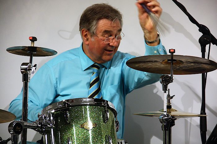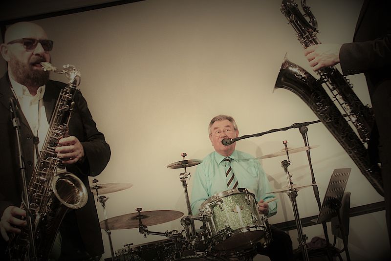 Er brachte den erdigen Drive in die Musik, wie zum Beispiel bei dem berühmten Jazzstandard „Caravan“, der rhythmisch an einen Kamelzug durch die Wüste erinnert. „Choo, Choo-Boogie“ und viele berühmte Songs aus Rhythm‘n‘Blues, Swing und dem Good-Time-Rock‘n’Roll exzellent gespielt, spannend arrangiert, komödiantisch präsentiert. Dafür gab es einen „Daumen hoch“, von einem besonderen Gast aus der letzten Reihe: Hermann Rarebell, Ex-Schlagzeuger der Scorpions, war nach Geretsried gekommen, in den Seniweg, wo Weltklasse-Musiker ein und aus.