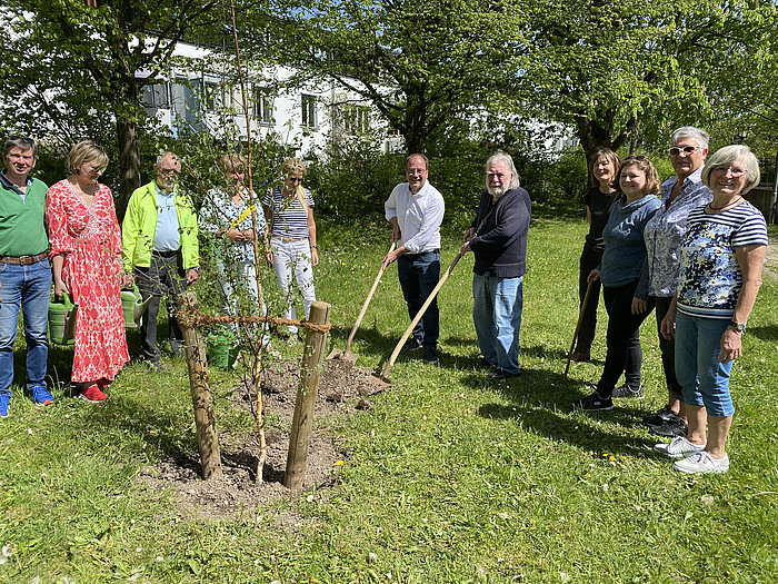 Das junge Bäumchen wurde zu Ehren des ehemaligen Stadtrats Volker Witte gepflanzt, der sich an der Weihnachtssitzung 2023 nach vielen Jahren Mitarbeit als Grünen-Politiker aus dem Stadtrat verabschiedete. „Dieser Baum spiegelt Dein großes Engagement wider“, ehrte Müller den Geretsrieder Politiker und Künstler im Kreise einiger Stadträte, die zur Pflanzung gekommen waren und tatkräftig gemeinsam das Bäumchen wässerten.
