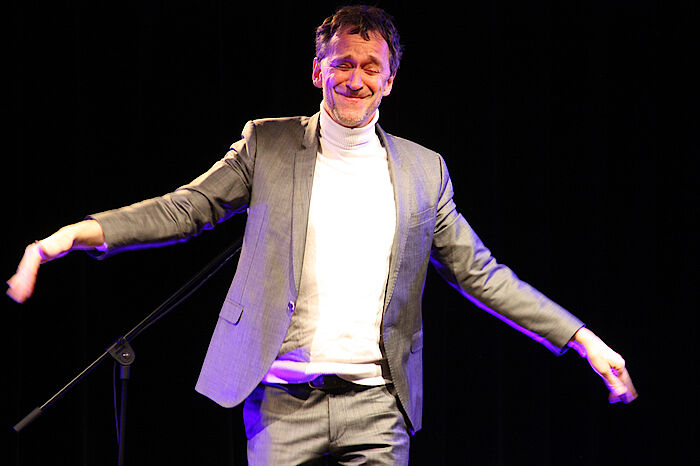 2021 werde ein sportliches Jahr, denn die Entscheidung sei nun doch für die Durchführung der Olympiade in Tokio gefallen, trotz Corona. Einige Disziplinen fänden sogar in Fukushima City statt, meint Meineke zu wissen: „Wir freuen uns schon auf die strahlenden Gesichter“. Die Tagesnachrichten seit Jahresbeginn gaben dem Kabarettisten Stoff genug für die nun folgenden 90 Minuten. Im Schwerpunkt natürlich die Impfstrategie und der derzeitig in die Schlagzeilen geratene Lieferstreit („Der Kindergarten der Nation“). Der jüngst vollzogene Brexit („Von Dover bis Calais – LKW an LKW“). Und die Geschehnisse um den unfreiwilligen Abgang des „psychotischen Sex Maniacs“ aus dem Weißen Haus. Ecco Meineke ist eine Rampensau, der kann singen, der kann über sich und andere hämisch lachen, der kann Visagen ziehen und in Rollen schlüpfen.