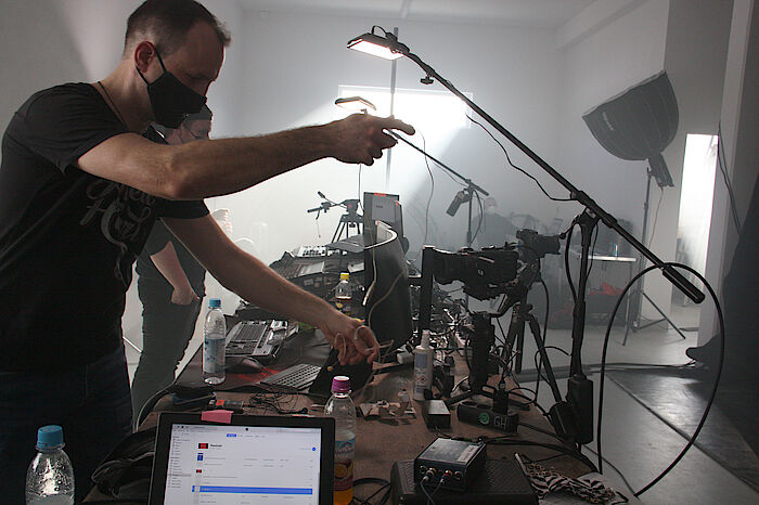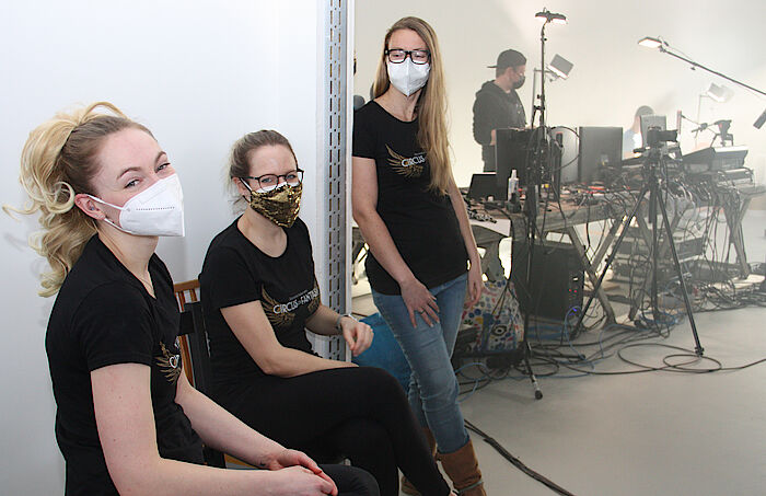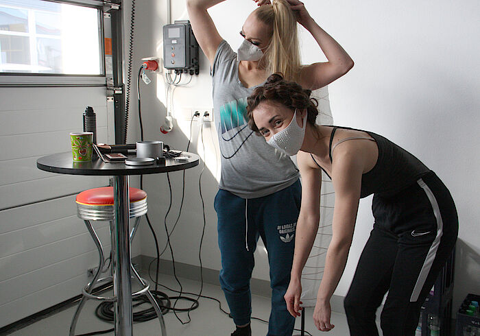 Normalerweise ist die Neubauhalle im Gewerbegebiet in Gelting, die Dominik Halamek als Lager für Bühnenrequisiten und -outfit nutzt, sachlich, hell und kühl. Für die Show haben sie mit schwarzer Molton-Meterware einen Bühnenbereich geschaffen und eine Lichtanlage auf Traversen gebaut. Unmittelbar gegenüber steuerte am Technikpult der Würzburger Jonas Mohr Ton, Licht und Videoübertragung, wie ein Kapitän ein großes Schiff in unbekannte Gewässer. Die Online-Show per Live-Stream war in der Tat für Dominik Halamek und sein Team Neuland. Während die Damen nebenan in der Maske die falschen Wimpern mit akkurater Genauigkeit anklebten, ließ Alexander Schneller seine Hula-Hoop-Reifen um die Hüften kreisen. Der Zirkusdirektor aus Wien unterrichtet bei Halameks „Ballett Factory“ Akrobatik und Artistik – derzeit ausschließlich online. Die Online-Kurse im November seien mit rund 2400 Teilnehmern sehr gut angenommen worden, freut sich Studio-Chef Halamek. „Als Alexander mich anrief und mir erklärte, wie kreativ ausgehungert er sei, dachte ich mir, dass eine live-übertragene Online-Show auch funktionieren könnte.“