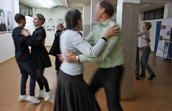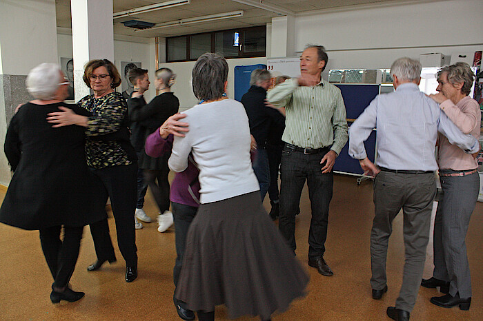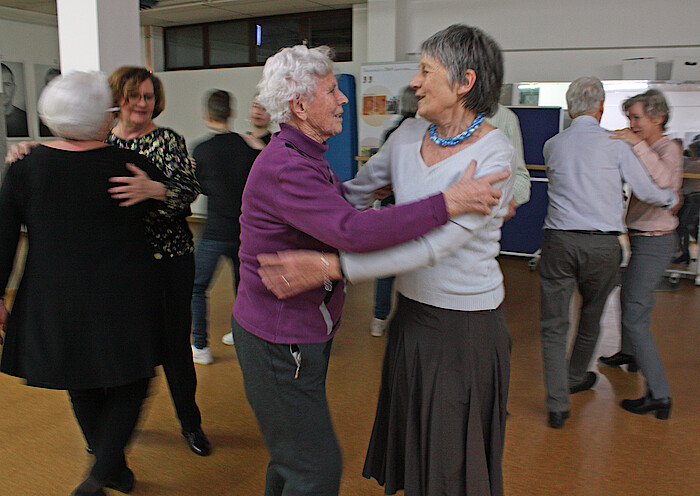 Es ist wieder ein Mittwochabend. Gut zehn Personen in fünf Pärchen gruppiert bewegen sich nach der Walzermusik aus dem CD-Player durch den großen Raum im Steiner Quartierstreff. Es sind hauptsächlich Frauen gekommen. „Mein Mann ist daheim geblieben, obwohl er gut tanzen könnte“, sagt eine Dame und führt eine andere im Takt der Musik.
