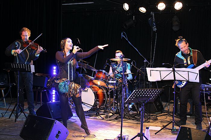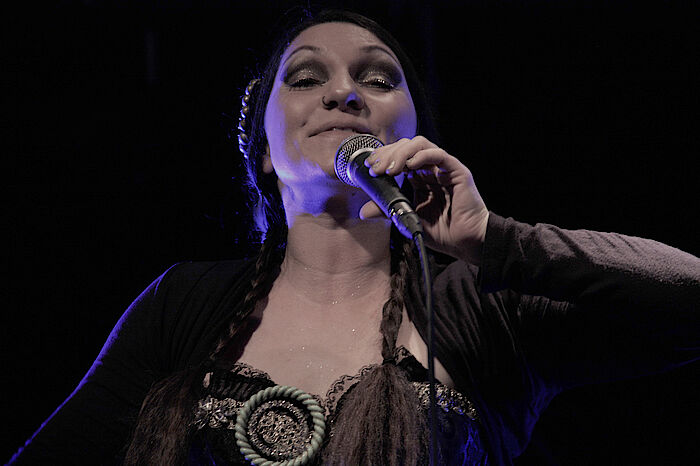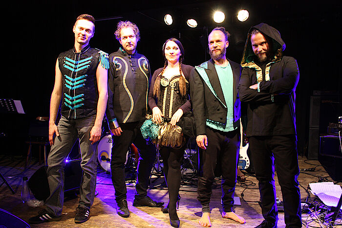 Der Anfang klang wie der Beginn eines Märchens der Gebürder Grimm. „Es war einmal oder war auch nicht ein Menschlein namens Zweigesicht, das sang und rang nach Worten an Orten voller Nacht und Licht“, war aus den Lautsprecherboxen zu hören. Gemeint war das Alter Ego von Miriam Arens, die kurz darauf grell geschminkt und in schillerndem Rock gekleidet zusammen mit vier weiteren Mitgliedern der Band Liliath den ersten Song eines in vielerlei Hinsicht ungewöhnlichen Konzertabends anstimmte. Dabei klang schon das Eröffnungsstück „Of White Bubbles“ wie die Hintergrundmusik zu einer Zirkusaufführung, die alle Sinne herausforderte. Sängerin Miriam Arens nannte es eine „illusorische Performance“, strich einmal kurz über ihre langen Zöpfe und bedankte sich schon vor dem zweiten Stück beim Kulturverein Isar-Loisach der die Livestream-Aufzeichnung ermöglichte.