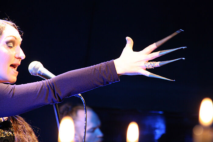 Wer den Youtube-Kanal des Hinterhalts anklickte, staunte zunächst über die Bühnenpräsenz und die variantenreiche Stimme der ausgebildeten Jazzsängerin. Das Klavierspiel von Max Oswald, die Violine von Niki Kampa, der Bass von Boris Boskovic und das Schlagzeug von Rainer Huber blieben meist dezent im Hintergrund. Ausufernde Solo-Einlagen gab es nicht. Stattdessen erzählte Arens über ihre „kleine Sozialneurose“, gescheiterte Beziehungen und innere Erleuchtungen. Diese esoterisch angehauchten Bekenntnisse erinnerten in einigen Momenten an die therapeutischen Stuhlkreise von Selbsthilfegruppen. Da tat es gut, wenn die Musik oder visuelle Reize wieder die Oberhand gewannen. So präsentierte Arens beim Stück „Klingen aus blankem Stahl“ ihre um fast 20 Zentimeter verlängerten Fingernägel, die wie die gefährlichen Krallen einer mittelalterlichen Hexe aussahen. Mit den eingespielten Geräuschen einer knarzenden Tür und eines Gewitters endete die abwechslungsreiche Bühnenshow der Band Liliath.