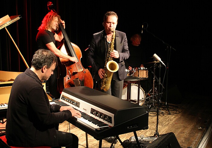 Nach der schwungvollen Eröffnungsnummer „Ada’s Song“ erklärte Francel die Geschichte des C-Melody-Saxophons, das 1923 in den USA zum Verkaufsschlager wurde. „Tausende wollten und konnten sich aufgrund des wirtschaftlichen Aufschwungs dieses Instrument als kleinen Luxus leisten, und so stapelten sich die C-Melodies bald als weihnachtlicher Verkaufsschlager unter den Christbäumen“, berichtete der Saxofonist. Der damalige Boom war jedoch nur von kurzer Dauer, weil Big Bands ab Anfang der 1930er Jahre auf komplexere Töne setzten. Mulo Francel schaffte es dennoch, mit diesem Instrument zu improvisieren und auch bekannte Kompositionen wie beispielsweise „Summertime“ von George Gershwin mit neuen Ideen zu bereichern. Auch das Liebesthema aus dem berühmten Charlie-Chaplin-Film „Goldrausch“ berührte die andächtig lauschenden Besucher auf Anhieb. Solo-Einlagen der anderen Musiker, mit denen Francel seit vielen Jahren in der Band Quadro Nuevo zusammenspielt. So widmete Pianist Chris Gall den Song „Yorke’s Guitar“ dem Sänger der berühmten britischen Rockband Radiohead. Sein virtuoses Klavierspiel war indes nur ein kurzer Ausflug in die Moderne.