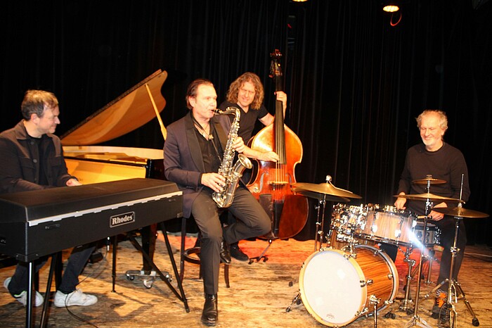 Geretsried-Gelting, 29.1.2024 – Seine Konzerte gelten nicht nur bei Jazz-Fans als Höhepunkte der Improvisation und Klangvielfalt. Beim Gastspiel in der Geltinger Kulturbühne Hinterhalt stellte Saxofonist Mulo Francel mit seiner experimentierfreudigen Band erneut sein Ausnahmetalent unter Beweis.