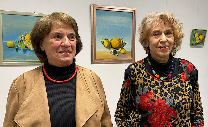 Ihre sechs Jahre ältere Schwester Cornelie Wolff studierte in München Kunst. Als Broterwerb arbeitete sie 40 Jahre bis zur Rente als archäologische Zeichnerin im Institut für Vorderasiatische Archäologie an der LMU in München. Sie hat sich durch ihre fotografische Detailgenauigkeit ihrer Zeichnungen einen internationalen Namen in der Fachbranche gemacht. Wolff arbeitet in Syrien, der Türkei und im Irak. Ihre Aquarelle von Zwiebeln und Brokkoli, von Auberginen und Blumenkohl, und ihre Ölbilder von Rosen und Frauenschuh begeisterten die Vernissage-Besucher. „Das ist so echt, als könnte man hineinbeißen“, sagt eine Dame bewundernswert. Kunstkenner und Galerist Albrecht Widmann ist bekanntlich ein unermüdlicher Tierschützer. „Wir haben entschieden, dass zwanzig Prozent der Verkaufseinnahmen dieser Ausstellung in Tierfutter investiert werden soll, für die Haustiere in der Ukraine, die verängstigt und orientierungslos zurückgelassen wurden“.
