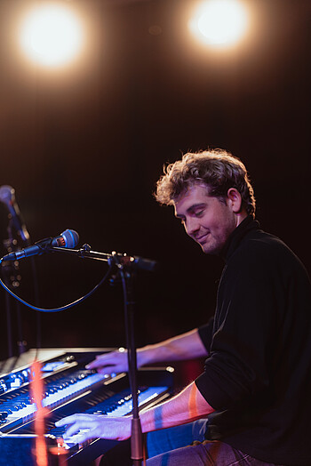 Zwölf Gitarren befinden sich im Wohnzimmer, auch ein Kontrabass und ein E-Piano. Bei den Vollmers liegt Musik in der Luft. Die Eltern sind erfolgreiche Musiker und Komponisten, die drei Söhne treten in ihre Fußstapfen. Der 26-jährige Elias reist extra für das Geretsrieder Konzert aus den Niederlanden an. Er erhielt ein Stipendium des European Jazz Masters, das er in Berlin, Paris und Amsterdam absolviert. In seiner Musik holt der junge Vollmer die Tradition der Hammond-Musiklegenden, wie Jimmy Smith und Jack McDuff, in die Gegenwart. Die sogenannte B3, die er am Samstag spielen wird, ist unter Hammond-Liebhabern bekannt für einen besonderen, raumfüllenden Klang, der durch die sogenannten „Leslies“ entsteht – zwei in sich drehende, schrankhohe Lautsprecher.