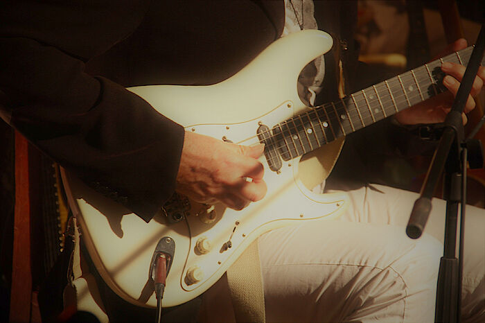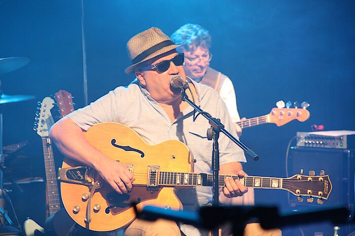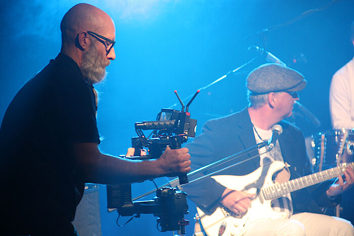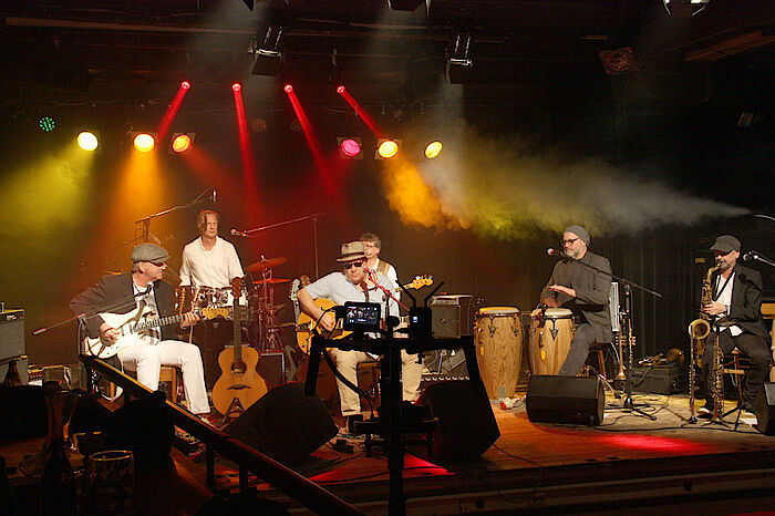 Mitglieder des Kulturvereins Isar-Loisach hatten mit einer Räumungsaktion Platz geschaffen, damit auch eine sechs-mannstarke Combo in Zeiten der Distanz gemeinsam auf der Bühne stehen kann, neben Schneider mit dabei Uli Lehmann am Bass, Oliver Stephan, der Sänger und Gitarrist mit dem Markenzeichen Sonnenbrille und soulig-raue Stimme, Hans Mühlegg am Schlagzeug und Marcio Tubino am Saxofon und an der Querflöte. Beim letzten Auftritt im vergangenen Jahr musste Percussionist und Trompeter Florian Sagner aufgrund der Abstandsregeln noch vom Parkett aus seine Congas und die Trompete spielen. Neue Schweinwerfer an Traversen an der Bühnendecke sorgen nun für besseres Licht bei der Bildübertragung ins Internet. Denn die Livestreams aus dem Hinterhalt werden wohl noch länger dafür sorgen, dass es im Oberland weit und breit die einzige Auftrittsmöglichkeit für Künstler und Musiker gibt.