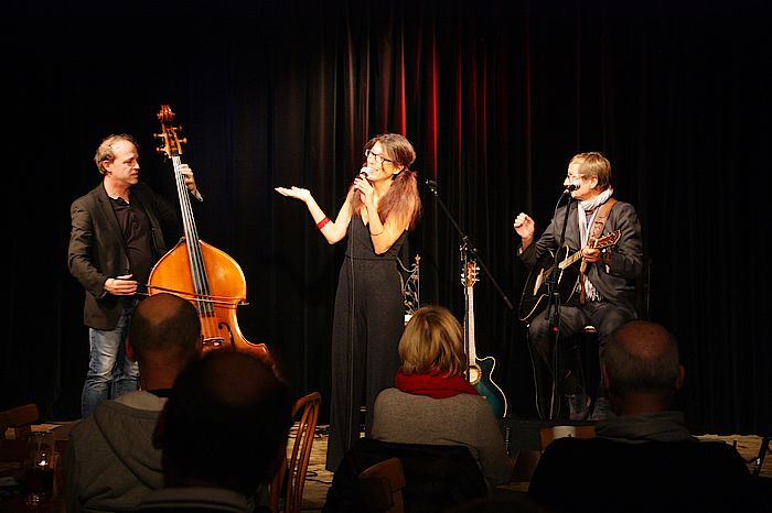„Es ist wichtig, dass wir in Geretsried auch Kunst abseits des Mainstreams anbieten“, lobte Bürgermeister Michael Müller. Der Rathauschef besuchte am Sonntagvormittag das Konzert des Trios Nostalgie. Alexandra Link-Lichius (Gesang und Gitarre), Peter Karnbaum (Gesang und Gitarre) sowie Thomas Kapfer-Arrington am Bass trafen mit ihrer Interpretation von französischen Chansons dabei den Nerv des frankophilen Publikums. Während des Konzerts stürmten sogar zwei Frauen der „Table Ronde Française de Geretsried“ auf die Bühne, um die zwei männlichen Mitglieder innig zu umarmen.