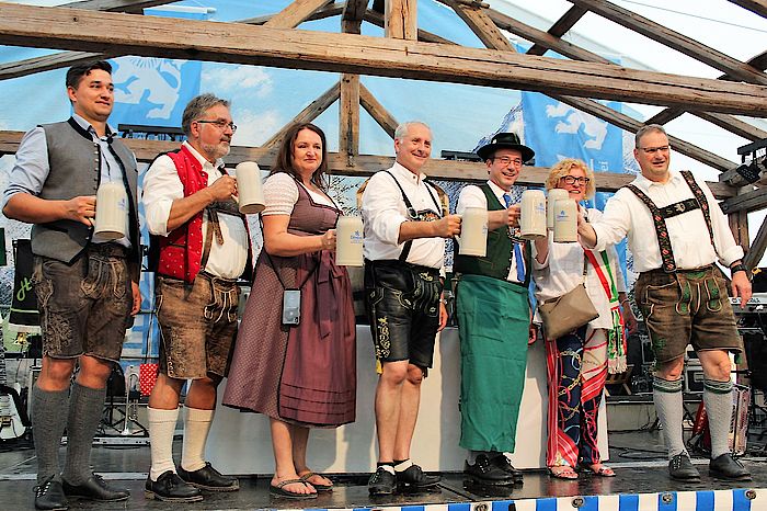 Im Festzelt angekommen, benötigte der Geretsrieder Bürgermeister Michael Müller drei Schläge, um das erste Fass anzuzapfen. Gemeinsam mit Landrat Josef Niedermaier, der Bürgermeisterin von Alano die Piave Amalia Serenella Bogana, Vertretern der Rosenheimer Auer Bräu GmbH sowie dem Festwirtepaar Claudia und Christian Fahrenschon prostete er dann von der Bühne aus der bierseligen Menge zu. Die Gartenberger Bunkerblasmusik sowie die Harthauser Musi sorgten anschließend für die passende Festzeltatmosphäre. Der Waldsommer läuft noch bis zum 4. August.