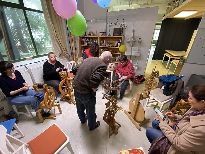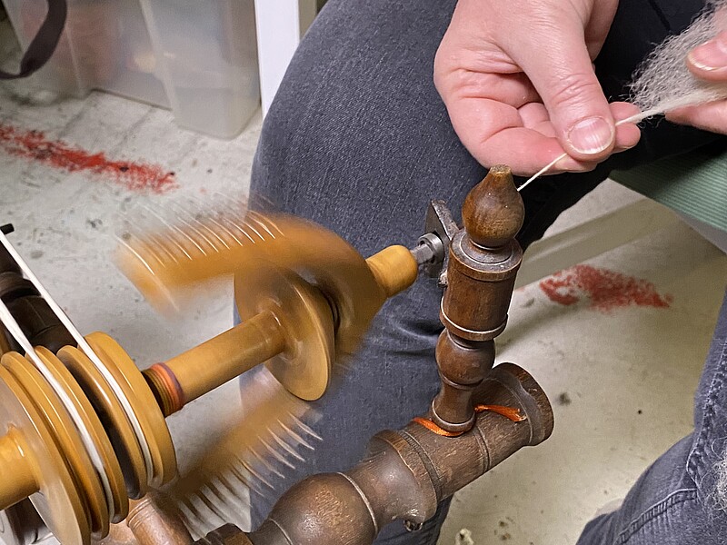 Es hat sich eine illustre Runde an den Spinnrädern gebildet. Während bei den Damen schon das Spinnrad läuft, kämpft der einzige Herr in der Runde noch mit dem Wollstrang. Das Rohmaterial besteht aus grober Schafswolle oder der weichen Merinowolle, die einfacher zu bearbeiten seien, erklärt Anett Sporer. Schwieriger sei es mit Naturfasern zu spinnen, zum Beispiel Wolle aus Zellulose- oder Soja-Fasern. Nur für Fortgeschrittene ist die Tussah-Seide geeignet. Bei Anfängern klappert das Fußpedal beim Antrieb des Spinnrads. Mit zunehmendem Können laufe das Rad dann leise und rund, weiß die Organisatorin, die seit gut zwanzig Jahren das historische Handwerk beherrscht. Ein paar Gesetzmäßigkeiten gibt es zu beachten: Rechts herum wird gesponnen, links herum gezwirnt. Denn jedes Garn besteht aus zwei gegenlaufenden Fäden, sonst „zwirbelt es sich auf“, erklärt Sporer. Je schneller das Spinnrad läuft, desto dünner das Garn. Man spinnt barfuß oder in Socken. „Wenn Du die Handgriffe und die Pedalbewegung erst einmal raus hast, dann kannst Du beim Spinnen sinnieren und abschalten.“