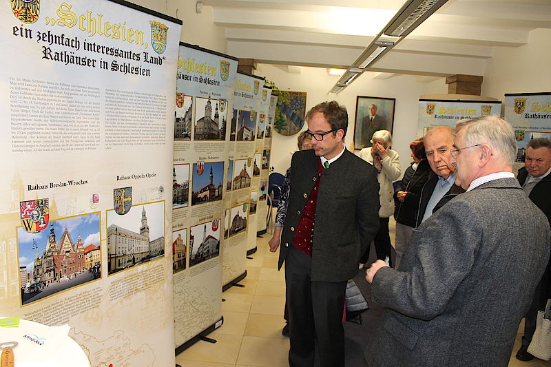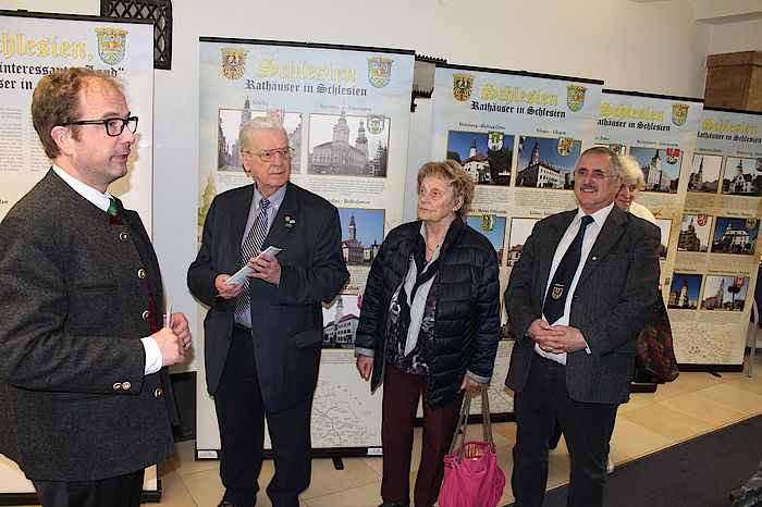 Geretsried, 11.4.2017 – 38 imposante Rathäuser aus dem ehemals deutschsprachigen Schlesien sind derzeit auf acht Schautafeln im Foyer des Geretsrieder Rathauses zu sehen. Ihre Bedeutung erklärte Dr. Gotthard Schneider von der schlesischen Landsmannschaft sowie der Geretsrieder Bürgermeister Michael Müller.