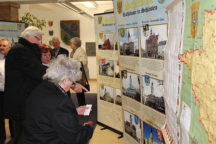 „Das Rathaus ist immer der erste Anlaufpunkt in einer Stadt“, weiß Bürgermeister Michael Müller aus eigener Erfahrung. Umso interessierter betrachtete er bei der feierlichen Eröffnung die acht Tafeln, die noch bis zum 5. Mai im Foyer ausgestellt sind. Sie zeigen 38 Rathäuser aus dem ehemals deutschsprachigen Schlesien, das im heutigen Polen liegt. Rudolf Maywald, Vorsitzender des Bezirksverbandes der Schlesier, brachte die Ausstellung nach Geretsried. Zusammen mit dem stellvertretenden Landesvorsitzenden der schlesischen Landsmannschaft Dr. Gotthard Schneider erklärte er rund 20 Besuchern die Bedeutung der Bauwerke. „Schlesien hat eine über 800-jährige deutsche Geschichte – das wissen heutzutage leider nicht mehr viele“, unterstrich Schneider den Sinn der Ausstellung.