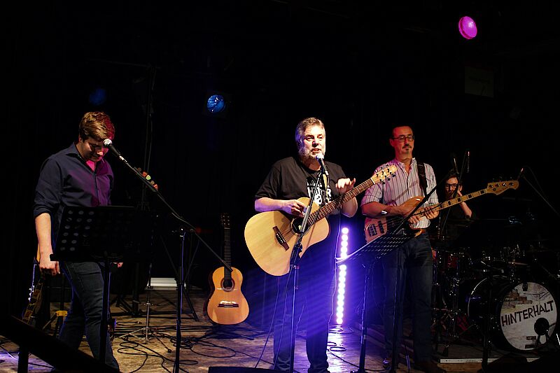 Nach seiner fast einstündigen Fesl-Hommage tauschte Hammerschmid die Instrumente und griff in die Saiten seiner E-Gitarre. Neben ihm postierten sich sein Sohn Marius am Schlagzeug sowie Günter und Maximilian Wagner, um mit einer rockigen Version des Georg-Danzer-Liedes „Lass mi amoi no d‘Sun aufgehn segn“ den zweiten Teil des Konzertabends zu eröffnen. Günter Wagner, der im Nordlandkreis vor allem als Organisator des Wolfratshauser Flussfestivals und des Geretsrieder Kulturherbstes bekannt wurde, sang zudem Lieder aus dem Frühschaffen von Wolfgang Ambros. Neben dessen Hit „Es lebe der Zentralfriedhof“ gab’s auch selten gespielte Nummern wie die österreichische Bob-Dylan-Übersetzung „Des Sandlers Flucht“ oder das beklemmende Obdachlosen-Lied „De Kinettn wo I schlof“ zu hören. Zwischendurch entlockte Maximilian Wagner dem Nostalgie-Klavier der Kulturbühne Hinterhalt berührende Töne. Die Neuinterpretation des einst von Wolfgang Ambros und André Heller gesungenen Duetts „Für immer jung“ war dann der würdige Abschluss eines gelungenen Abends, der aufgrund coronabedingter Vorgaben wie immer als Livestream ins Internet übertragen wurde.