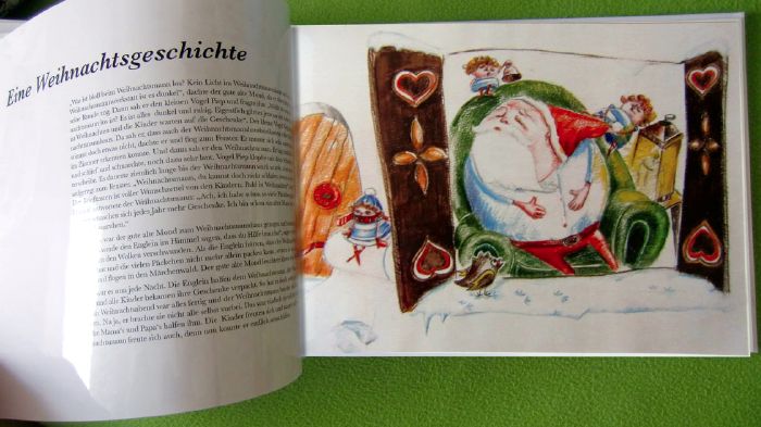 Acht solcher Kurzgeschichten von Oma Karin kamen im Laufe der Jahre zusammen, zeitgleich illustrierte Isabel Heß die einzelnen Geschichten. „Ich brauchte schon einige Versuche, um mein Kind Luise als gezeichnete Figur zu charakterisieren, so wie sie auch in Wirklichkeit ist“, erklärt die Grafik-Designerin, die in Dessau studiert hat. Detailgetreu und mit einem spitzbübigen Ausdruck stellt Heß die Szenen dar. Kugelbauchig ist der Nikolaus in der Weihnachtsepisode zu sehen. Auf seiner Schulter sitzt Luise und klingelt ihm mit dem Glöckchen frech ins Ohr. Sie trägt Kleider, die das Kind auch in echt besitzt, und spielt mit Stoffpuppen, die die rührige Oma tatsächlich gehäkelt hat. Man sucht in den Bildern und findet unheimlich viel. Isabel Heß‘ Farben sind besonders. „Ich nenne sie Unfarben, weil man nicht definieren kann, ist es ein Blau oder ein Grün oder ein weißabgedecktes Türkis“, erklärt die Grafikerin.