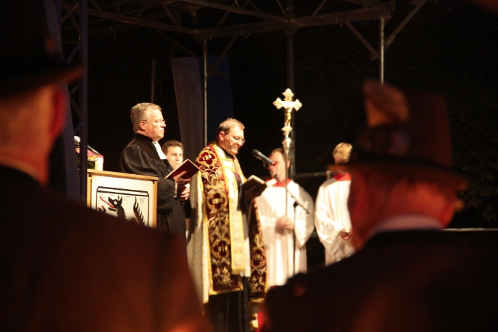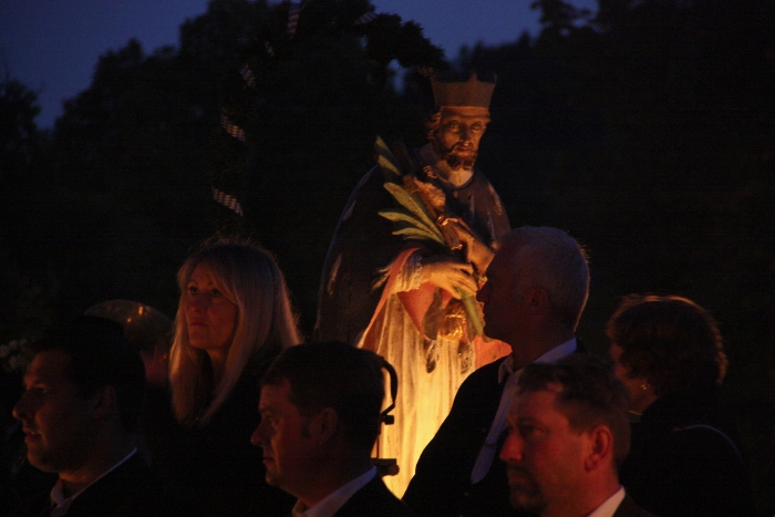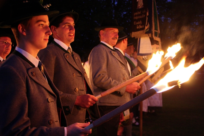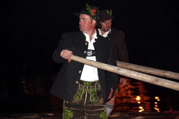Nachdem die donnernden Böllerschüsse der Schützen verstummt waren, näherten sich langsam treibend, zwei mit Fackeln beleuchtete Flöße und legten an der Alten Floßlände an, wo ein Altar aufgebaut war. Gleichzeitig marschierten die Traditionsvereine im Fackelzug auf das Gelände und beleuchteten das Arial. Dabei spielte die Stadtkapelle die traditionelle Nepomukmusik.