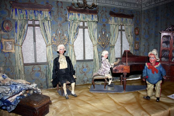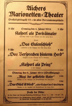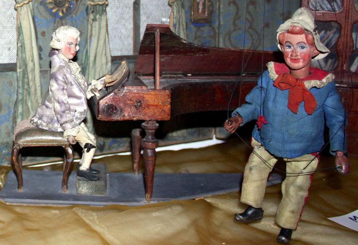 Der kleine Bursche an feinen Fäden ist genauso alt wie sein österreichischer Arbeitgeber. Er hat ein Grinsen im Gesicht und einen spitzen Filzhut auf. Es ist der Kasperl Larifari, eine Nachbildung der berühmten bayrischen Puppenfigur von Franz Graf von Pocci. Aber wie kam der Kasperl nach Salzburg? Barbara Heuberber, die Erbin und Geschäftsführerin des Salzburger Marionettentheaters eröffnete die Ausstellung mit einem Blick zurück in die Geschichte ihres Theaters: 1913 erfüllte sich der Salzburger Bildhauer Anton Aicher seinen Traum vom Puppentheater und richtete es im Turnsaal des fürsterzbischöflichen Borromäums ein. Heute ist daraus ein weltbekanntes Marionettentheater geworden. Das neunköpfige Puppenspieler-Ensemble geht jährlich für drei Monate auf Welttournee. Damals lernte Anton Aicher von Papa Schmid, dem Gründer des Münchner Marionettentheaters, wie man Puppen an Fäden baut und entwickelte eine ganz eigene Spieltechnik, die sich bis heute bewährt. Bei Papa Schmid sah Aicher den Kasperl Larifari, den Graf Pocci als Kindertheaterfigur erfunden hatte. Er baute eine Nachbildung, die derzeit im Hollerhaus als Original zu sehen ist.