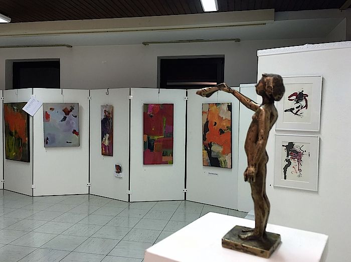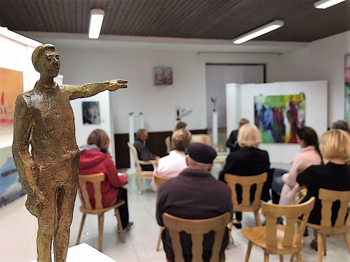 Dort stellen neben den beiden genannten Künstlern eine Handvoll weiterer Maler, Bildhauer und Schmuckhersteller ihre Werke noch bis 8. Oktober aus. Die kleine Exposition ist sehenswert. Laut KIL-Vorstandsmitglied Andrea Weber haben bislang täglich etwa 25 Besucher vorbeigeschaut. Ebenso viele Interessierte kamen zu der von Hannes Kirchhofer moderierten Talkrunde. Dass der langjährige Vorsitzende der Musikschule kein Experte für Malerei ist, schadete überhaupt nicht. Er stellte Fragen, die wohl jedem Kunstfreund und Betrachter schon einmal durch den Kopf gegangen sind.