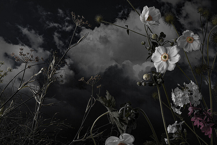 Zarte Anemonen, filigrane Gräser, Flochs, Schafgarbe, Kornblumen recken kraftvoll ihre Blütenstängel gegen einen schwarzen Unwetterhimmel. Bedrohlich wirkt die Szenerie. „Manche fragen mich, ob ich in der Wiese liege und fotografiere“, sagt Esenbeck. Doch Esenbeck arrangiert die Wiesenblumen im Wohnzimmer. Fotografiert separat Wolkenstimmungen und druckt die Bilder als großflächigen Studio-Hintergrund aus. Das Licht spielt eine entscheidende Rolle. Lange tüftele sie herum, bis jede Blume ganz natürlich wirkt. Dann wartet sie auf den entscheidenden Moment, wenn die Abendsonne durchs Fenster scheint, und die Blüten zum Leuchten bringt. „Schiebt sich eine Wolke davor, war die Mühe umsonst.“ Wie sie den Wolkenhintergrund schwarz einfärbt, will Esenbeck allerdings nicht verraten. Das bleibt ihr künstlerisches Geheimnis.