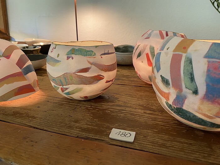 Erstmals mit dabei ist Isabel de Magalhaes. Die gebürtige Brasilianerin lebt in Münsing. Ihre Gefäße aus weißem und eingefärbtem Porzellan sind nur ein Hauch. Licht schimmert durch sie hindurch. Sie sind handgeformt und in weißen und farbigen Schichten verarbeitet, so dass ein unvorhergesehener Farbverlauf entsteht – „wie kleine Phantasiebilder“, sagt die Künstlerin und ergänzt: „Die Produktion ist für mich Meditation.“