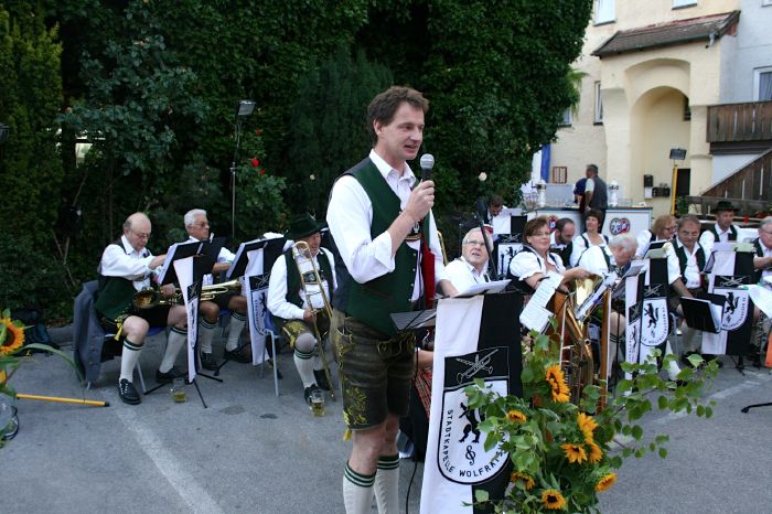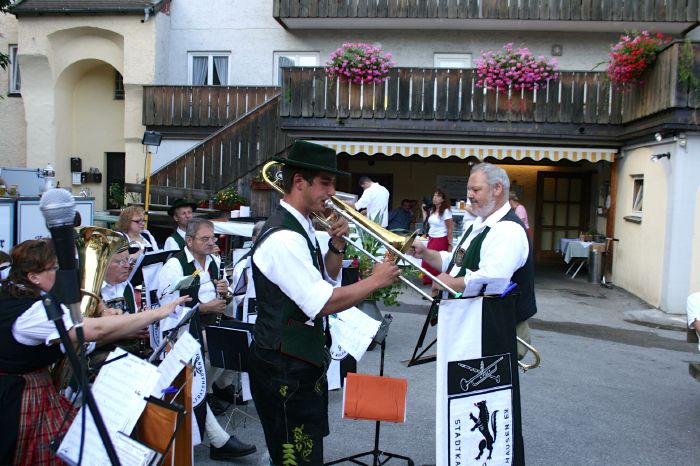 Da passte es gut, dass die Stadtkapelle an diesem Abend zum ersten Mal das von Anderl Wagner komponierte Stück „Städtepartnerschaft“ vor einem großen Publikum präsentierte. Die Marsch-Polka „Auf zur Floßfahrt“ beendete schließlich den ersten Teil des Sommerkonzerts. Die rund 200 Besucher – unter ihnen auch Bürgermeister Helmut Forster mit Frau Elsa sowie Kulturreferent Ludwig Gollwitzer – ließen sich die Spanferkel, Farmersteak und Grillwürste schmecken. Mit den Zugaben „Blasmusik im Herzen“, „Böhmischer Traum“ und der obligatorischen Bayernhymne endete der musikalische Sommerabend.