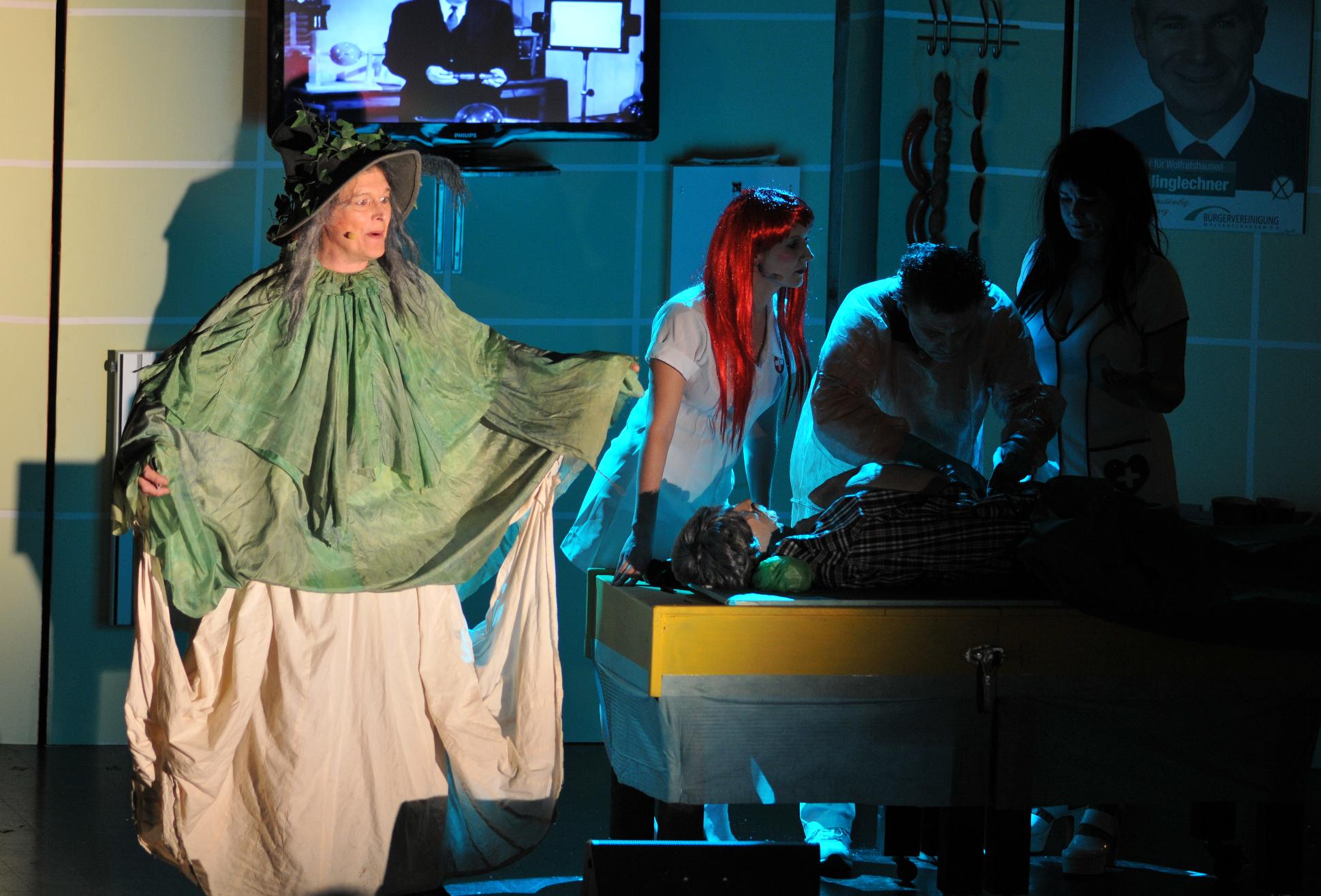 Und somit öffnete sich der Vorhang zur „Rocky Wor´ror Picture Show“. Im Schein der Brockard-Lampen („Aber einen super Pariser-Flair haben´s, die vergrößerten Grableuchten“) rollten zwei angeschickerte Wärter (Max Prestel und Thomas Schmidt) die Überreste des Bürgers rein. „Ja, um Gottes Willen“, entsetzte sich Dr. Frankenstein (Franz Foitzik) bei dessen Anblick, „der schaut ja aus wie ein typischer Wolfratshauser: blass, blutleer, farblos- aber ganz schön aufgebläht...“. Alle Kunst war da vergebens, zur Wiederbelebung reichte es nicht. Aber: Man könnte sich aus den Resten ja einen neuen Bürgermeister basteln. Den brauche es schließlich derzeit in der Loisachstadt. Man nehme also den Bürger als Basis und puzzle aus den bekannten Kandidaten für´s Amt, „von denen derzeit genug rumhängen“, einen perfekten Bürgermeister zusammen. Doch Frankenstein stieß schnell an Hürden, etwa beim Beginn mit dem Hirn, „weil da hat es bis dato noch am meisten gefehlt“. Doch in keiner der Kisten, in denen die offiziellen Bürgermeisterkandidaten lagerten, wurden die Assistentinnen fündig in Sachen Hirn. „Gut, dann schauen wir im Keller, ob da noch Hirngespinste der Stadträte rumliegen“, schlug Frankenstein vor. Ebenso schwer zu finden: ein breites Kreuz. Auch große neue Augen brauchte die Rathauschef-Kreatur, „zwecks dem Weitblick mit Visionen“. Ein „Kopf“ (Florian Roth) sowie zwei ganze Leichen (Christian Foitzik und Jörg Schwenger), die im Labor sprichwörtlich „rumhingen“, hatten dazwischen Zeit, ihre Kommentare abzugeben zur Kommunalpolitik: „Wenn in Wolfratshausen noch mehr abgesägt werden, dann könnte das neue Archiv als Super-Leichen-Lager dienen. Dort könnte die CSU gleich den Kugler auf einen Fleischer-Haken dazu hängen, und die Bürgervereinigung den Gollwitzer“. Apropos: Das machte bei den beiden Appetit auf ein paar „Gollwitzler“, ein Synonym für „beleidigte Leberwürste“. Oder waren das nicht eher „Wittstädtler“? Wurst, im doppelten Sinne.