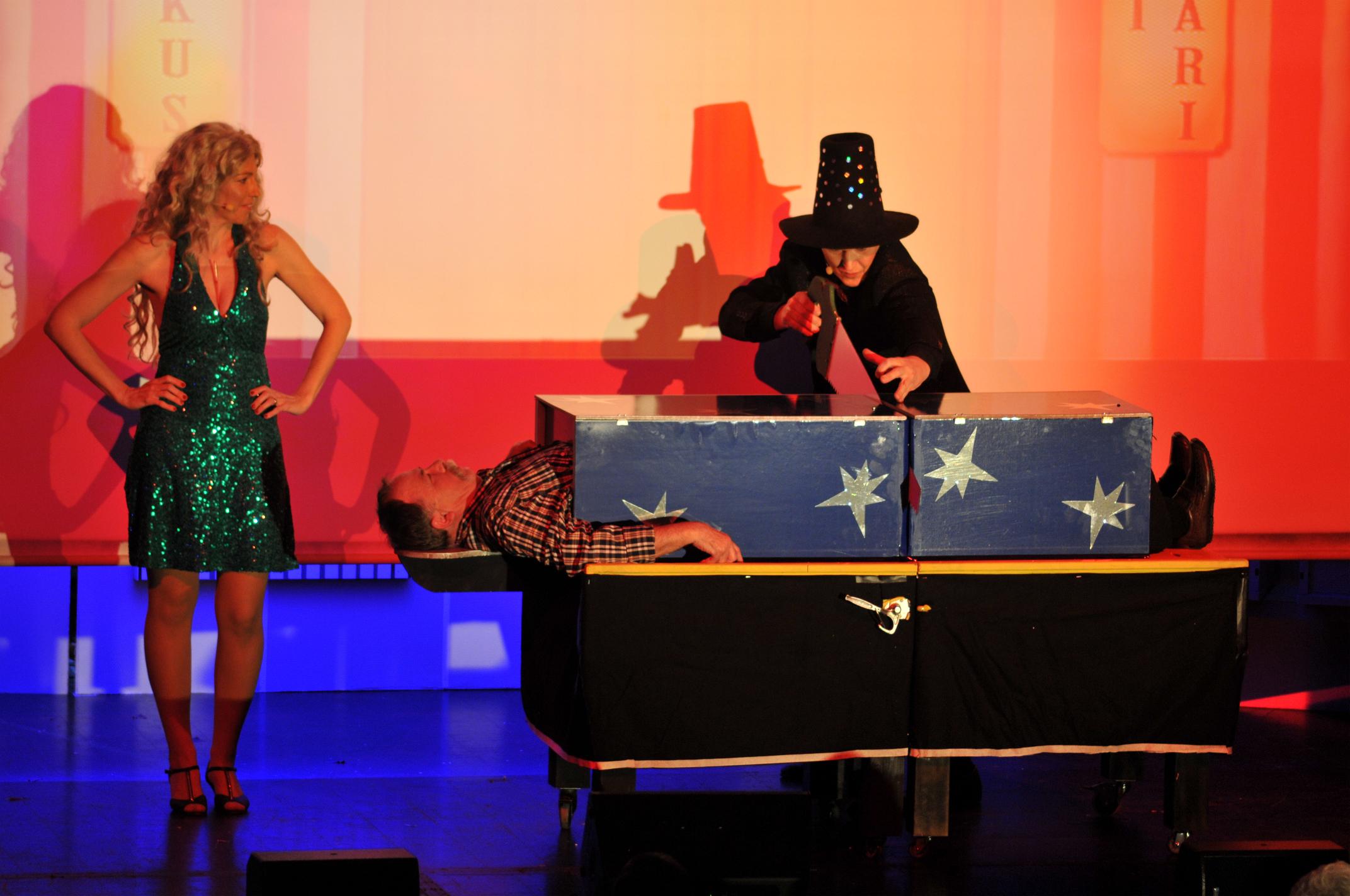 Laut und herzlich lachend goutierten die vielen Gäste den ironischen, aber auch selbstironischen Blick in den Spiegel der Zeit beziehungsweise in das „Gruselkabinett der Kommunalwahlen“. Denn das diesjährige Singspiel stand ganz unter dem Motto „Rocky Wor'ror Picture Show“. Und es zeigte den künftigen Bürgermeister von Wolfratshausen als den Menschen, der er laut Wahlversprechungen gerne sein würde: Perfekt nämlich. Zunächst aber sah alles noch nach einer Wiederholungstat aus: Der Zauberer vom vergangenen Jahr (Hermann Paetzmann) trat nochmals auf und wollte während seiner Zirkusshow eine Jungfrau zersägen. An der aber mangelte es leider: „Das Röschen Dorn wurde doch entführt. Die letzte Jungfrau haben Wolfratshauser Sittenwächter mit ihr in der Loisach versenkt“, wusste seine Assistentin Jakeline (Christine Brauner). Was oder wen also als Ersatz nehmen? Ein „Auslaufmodell aus dem Stadtrat“ vielleicht? Sie aber waren dem Zauberer nicht aus dem richtigen Holz geschnitzt: Manche seien „Spaltholz“, andere „Weichholz“, die dritten „Antikholz“ oder hatten sich bereits „selbst abgesägt“. Somit traf es einen Wolfratshauser Bürger (Fritz Reinhardt). Doch nach der erfolgreichen Zersägung passierte es: Bei der „Bürgervereinigung, respektive der Wiedervereinigung des Bürgers“, passten die Hälften nicht mehr zusammen. Da konnte nur noch das „Cima-Labor“ helfen: „Die haben Erfahrung in Sachen Wiederbelebung“.