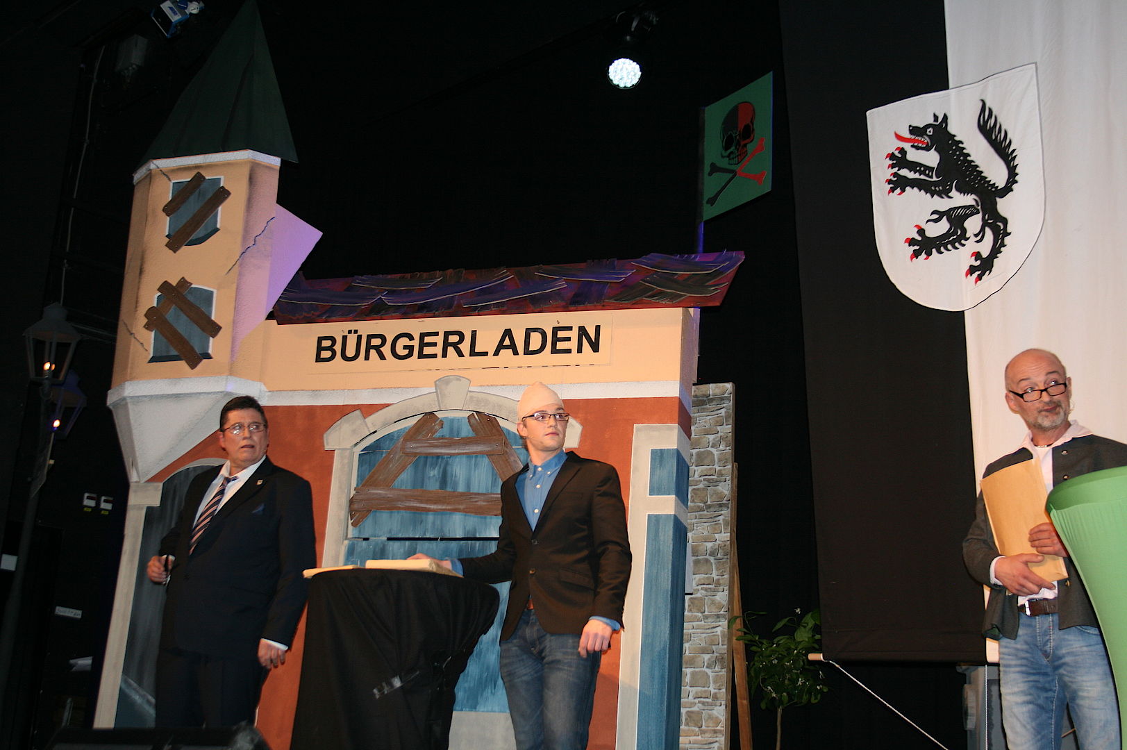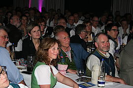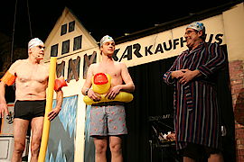 Auch das Geschehen in der Nachbarstadt Geretsried wurde aufs Korn genommen. Als Bürgermeister Michael Müller (Georg Steinbichler), Stadtrat Volker Reeh (Felix Unterberger) und Dritter Bürgermeister Gerhard Meinl (Wiggerl Gollwitzer) die Bühne betraten, um das neue Hallenbad zu „promoten“, lachte das Publikum laut auf. Denn schon allein die Bademützen mit dem Geretsrieder Stadtwappen trafen voll den Nerv der 588 Gäste. Dass die Kostenkalkulation des Bades für Kontroversen sorge, sei laut Meinl ganz normal: „So eine Kalkulation ist eine komplizierte Sache. Da gibt es viele Unbekannte: Wassertiefe, Sprungbrett, Sauna. Das können Sie sich mit ihrem begrenzten Wolfratshauser Horizont gar nicht vorstellen“. Durchaus vorstellbar seien indes Führungen durch die leere Markstraße, in der in den vergangenen Jahren mehr und mehr Läden schließen mussten. „Wolfratshausen ist ja bald eine reine Geisterstadt“, entfuhr es einem Touristen.
