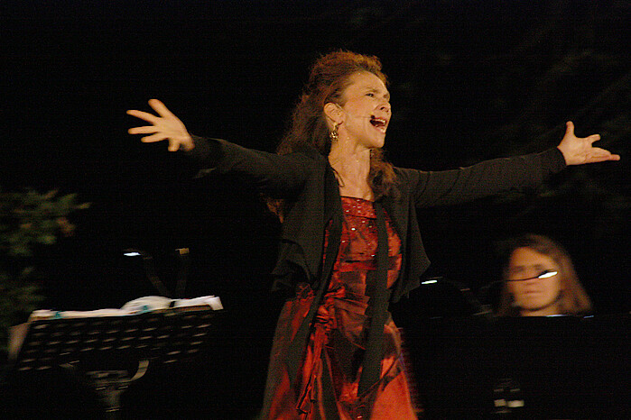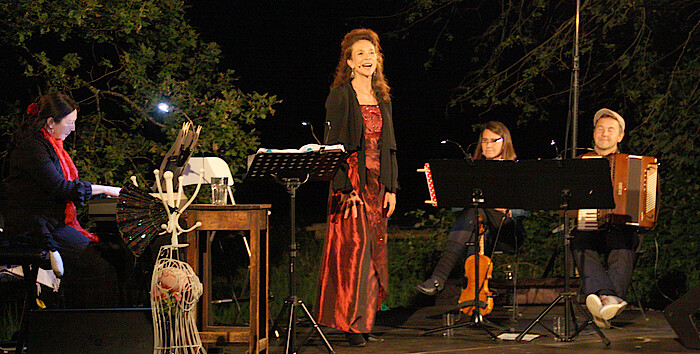 Piazolla wurde in Buenos Aires geboren, wuchs in Amerika auf. Er war ein behütetes Kind. Er liebte seinen Vater, der ihm ein Pandoneon schenkte und damit begann Piazollas Liebe zum Tango. Der Tod des Vaters brachte sein Leben ins Schwanken. Er ging nach Frankreich um Komposition zu studieren. Erst im Alter von 60 Jahren verdiente Piazolla mit seiner Musik Geld. Piazzolla schrieb außergewöhnliche Stücke, die Melancholie, Disharmonie, Tiefsinn vereinen. Es ist die Musik des unkaschierten Alltags. „Er wollte etwas bewegen“, so Bettina Ullich. Ein Trauer-Tango zum Tode seines Vaters „Addios Nonino“, eine musikalische Fiktion der Zukunft „Preludio del ano 3001“ oder ein Lied für einen Verrückten „Ballada para un loco“. Bettina Ullrich hat die feinsinnige Stimme für den Tango und ihr Ensemble das richtige Gefühl für diese hoch emotionale Musik. Es war kein Tanzabend unter Sternenhimmel. Es war ein anspruchsvoller Kunstgenuss bei Wein und Zirpenklang.