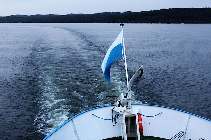 Zur Historie auf dem Starnberger See zählt die MS Bayern selbst. Das Motorschiff ist der älteste der derzeit verkehrenden Ausflugsdampfer. Mit dem Bau wurde 1938 in einer Deggendorfer Werft begonnen. Wegen des Zweiten Weltkrieges wurde die Inneneinrichtung aber erst 1948 fertiggestellt und das Schiff in Betrieb genommen. Weil es zur Rundfahrt regnet und nur rund zwölf Grad Celsius hat, haben viele der Gäste Schirme mit und wetterfeste Jacken an. Fast alle zieht es in die Innenräume des Schiffes. Der Eurasburger Klarinettist Heini Zapf spielt mit Musikerkollegen in den Pausen zwischen den Erläuterungen von Reisner und Scriba.