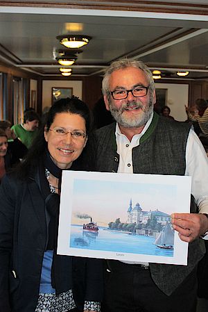 Berg/Münsing, 11.9.2017 – Die Historie am Starnberger See ist vielfältig – vom italienischen In-Lokal im 19. Jahrhundert, der Sommerfrische von Hofbeamten, Künstlern und Intellektuellen bis zu den Herrschaftssitzen der Wittelsbacher. Auf diese Spuren hat sich der Historische Verein Wolfratshausen begeben. Am Samstag hatten die Mitglieder eine rund drei Stunden lange, historische Schifffahrt auf der MS Bayern mit dem Ausgangs- und Endpunkt Berg organisiert. Der zweite Vereinsvorsitzende Bernhard Reisner und Ursula Scriba, Vorsitzende vom Ostuferschutzverband, boten den mehr als 100 Gästen einen anekdotensatten Überblick zu historischen Bauwerken und Bewohnern rund um den See.