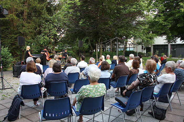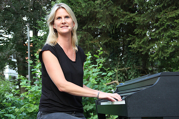 Mit „Alles auf Liebe“ gastierte Lucy van Kuhl mit ihrer Es-Chord-Band erstmals im Rahmen der Reihe „Kulturpicknick“ im Garten der Wolfratshauser Stadtbücherei. Lucy van Kuhl mit ihrer Band ist bei Konstantin Weckers Label „Sturm & Klang“ unter Vertrag. Sie gewann 2019 das Passauer „ScharfrichterBeil“ und 2021 den roten „Stuttgarter Besen“ (Publikumspreis) für ihre ganz eigenwillige Kombination aus Chanson und Kabarett.