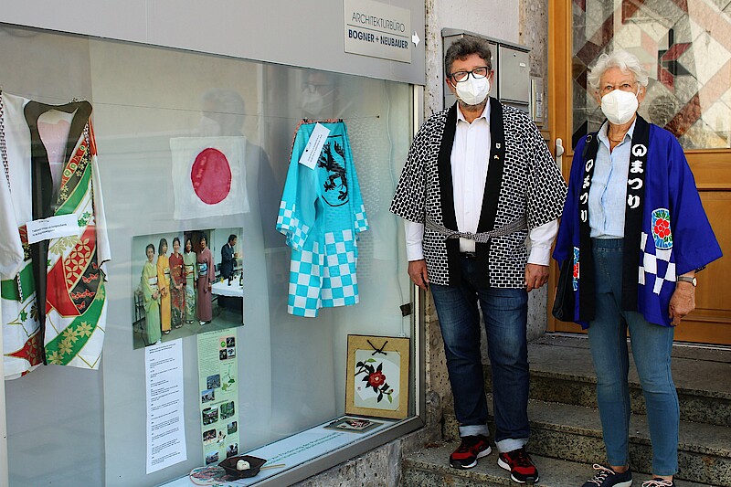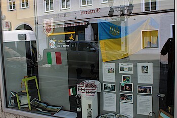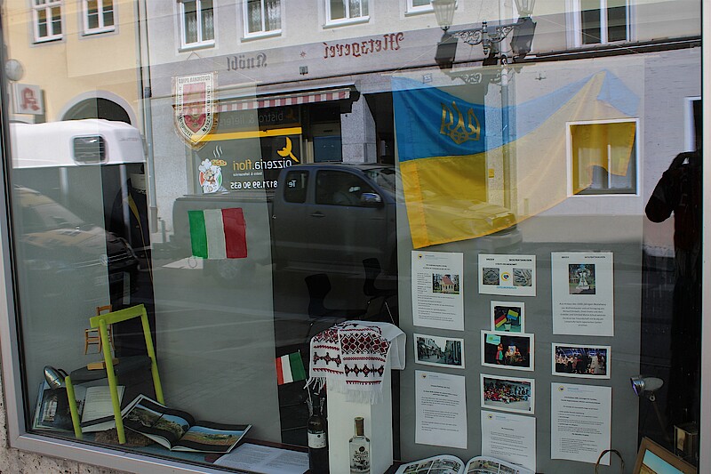 Wolfratshausen, 12. 5. 2021 – Seit dem 8. Mai sind in den Schaufenstern des vom Kulturverein Isar-Loisach (KIL) angemieteten Kunstturms Dinge zu sehen, die an die Städtepartnerschaften mit Barbezieux (Frankreich) und Iruma (Japan), sowie an die Freundschaften mit Manzano (Italien), Brody (Ukraine) und dem Patenschiff Oste erinnern.