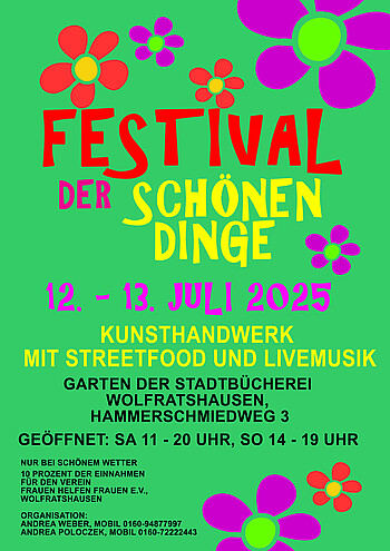 Wolfratshausen, 8.7.2025 – Am Wochenende vom 12. und 13. Juli findet wieder das kleine aber feine und bunte „Festival der schönen Dinge“ im Garten der Stadtbücherei Wolfratshausen statt. Öffnungszeiten sind am Samstag von 11 bis 20 Uhr, am Sonntag von 14 bis 19 Uhr. Heuer mit viel Live-Musik und köstlichem Streetfood. Nicht zu vergessen: Es stellen wieder 14 Kunsthandwerker ihre ganz besonderen Arbeiten aus.