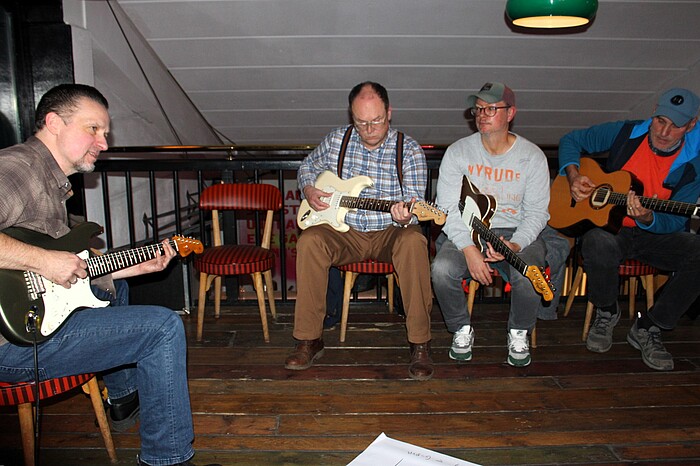 Zu zwei kurzweiligen Übungsstunden lud Kai Strauss am Samstagnachmittag rund ein Dutzend Hobbygitarristen in die benachbarte Bar „LJ’s“ ein. Kurz darauf gingen die Teilnehmern wieder in den Keller, um den Auftritt der „Vollmer Brothers“ nicht zu versäumen. Die in Geretsried aufgewachsenen Brüder Victor und Elias präsentierten zusammen mit dem österreichischen Schlagzeuger Steven Moser neben Blues auch Songs, die stark vom Soul, Jazz und Gospel beeinflusst waren. Michael Sedlatschek, Sänger der Chiemgauer Band „Tscheky & The Blues Kings“ gefiel das so gut, dass er Victor Vollmer am Ende des darauffolgenden Konzerts zum gemeinsamen Musizieren mit auf die Bühne holte.