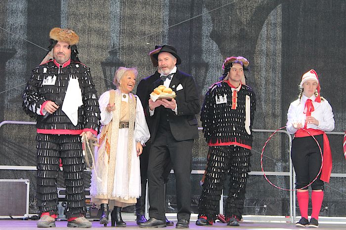Mit frechen Gstanzln und Coverversionen bekannter Hits eröffnete der Geretsrieder Kulturreferent Hans Ketelhut in seiner Funktion als Entertainer „Bayern-Hans“ am frühen Nachmittag die Gaudi in der Marktstraße. Zu diesem Zeitpunkt verloren sich noch wenige Besucher vor der großen Bühne am Marienplatz. Doch mit dem lautstarken Einzug der Geretsrieder Urzeln und der Wolfratshauser Stadtkapelle ändert sich die Szenerie schlagartig. Plötzlich war Leben in der zuvor so ruhigen Altstadt. „Mit Schellen und Peitschen vertreiben wir die bösen Geister“, erklärte ein Urzel den alten Brauch. Danach jonglierten zwei Geretsriederinnen mit Reifen, auf denen kleine Weingläser aufgestellt waren. Und Ursula Meyndt von den Siebenbürger Sachsen reichte Bürgermeister Klaus Heilinglechner einen Teller voller Schmalzgebäck. „Die pack‘ ich nicht alle, die muss ich gleich weiterreichen“, winkte der Rathauschef ab. Erschienen war er im schwarzen Hochzeitsanzug seines Großvaters. „Das ist Qualität, die was aushält“, sagte Heilinglechner mit einem Augenzwinkern.