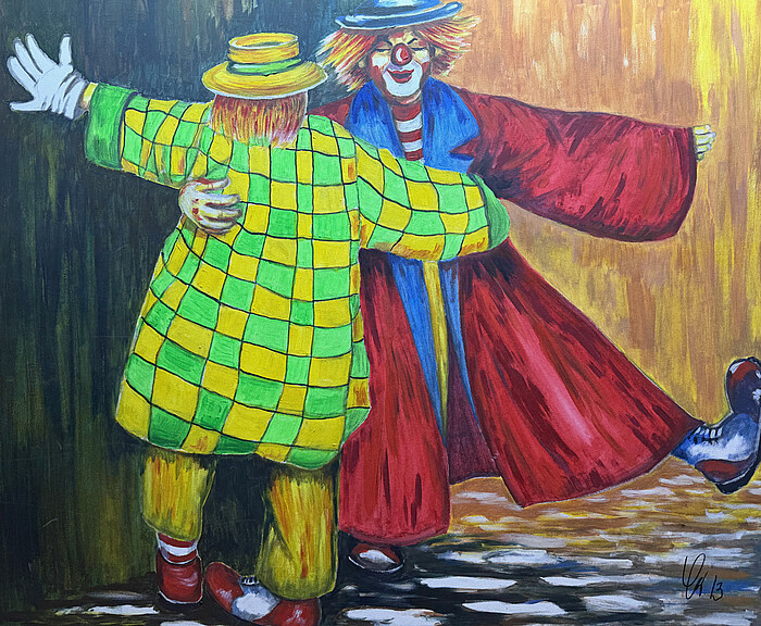 Die Geschichte der „Spaßmacher“ beginne schon 500 Jahre vor unserer Zeit, erläuterte der Künstler selbst in einer kleinen Rede bei der Eröffnung seiner Ausstellung. Dieser „kleine Mann, der die Obrigkeit gerne neckt und sich seine Nischen sucht, wo er was verdrehen kann“, fasziniere den 78-jährigen Künstler Zeit seines Lebens. Hans-Dieter Hormann ist ein Arbeiterkind aus Mönchengladbach. Als Junge habe er in einem Spielwarengeschäft zum ersten Mal ein Clowngesicht gesehen und sich gefragt: „Wer bist denn Du?“. Er fand ein Buch mit der Biografie des legendären Clowns Grock. Seitdem sammelt Hormann alles was er finden kann aus der Welt des Kasperls, des Hans Wursts, der Harlekine und der Figuren der italienischen Commedia dell’arte. Er kennt viele der berühmten Clowns aus aller Welt persönlich. Seinen zusammengetragenen „Schatz“ zeigt er in seinem Clownmuseum in Wien. Dort können die Besucher erfahren, dass Clowns mehr sind, als Zirkusfiguren, so auch der Titel der aktuellen Ausstellung.