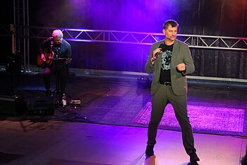 Wolfratshausen, 14.7.2025 – Er ist ein gern gesehener Gast auf der schwimmenden Bühne am Loisachufer. Zum wiederholten Mal brachte der Kabarettist Michael Altinger die Besucher des Fluss Festivals zum Lachen - und erinnerte dabei auch an fiktive Vorfahren wie Galileo Altinger oder den Wikinger Altingerson.