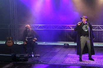 Begleitet von melodramatischer Filmmusik, betrat Michael Altinger in Cowboymontur die Bühne und griff zu einer weißen Tasse, die laut eigener Aussage voller Testosteron war. Das Männlichkeits-Hormon schien den 54-Jährigen zu beflügeln. So schlüpfte er mal mit amerikanischem Slang in die Rolle des US-Präsidenten Donald Trump, der den bayerischen Ministerpräsidenten Markus Söder zum Verkauf des Freistaats überredet und dafür 13 Bratwürste erhält. Danach gab Altinger zu den lauten E-Gitarren-Klängen seines Bühnenpartners Andreas Rother Rocksongs und Schlager mit amüsanten Texten zum Besten. „Ich bin ein weltoffener, linksgrün versiffter Best-Ager“, bekannte der gebürtige Landshuter. Bei Grillpartys überlasse Altinger seiner Frau die Arbeit, während er sich um die Getränke kümmere.