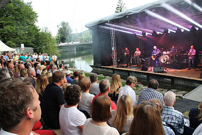 Das Wetter hielt. Es war sommerlich heiß und die Stimmung dementsprechend ausgelassen fröhlich bei den Publikumsgästen, die von nah und fern ans Loisachufer kamen. „Unser Flussfestival hat sich inzwischen einen so guten Namen gemacht, dass wir Künstler wie Rainhard Fendrich nach Wolfratshausen locken können“, freute sich Bürgermeister Klaus Heilinglechner und übergab dem Österreicher die Bühne, der nicht lange mit Begrüßungsfloskeln fackelte, sondern soundtechnisch kraftvoll „Es lebe der Sport“ ins Publikum schmetterte. Und die sangen sportlich begeistert mit. Denn eingefleischte Fendrich-Fans kennen alle Fendrich-Lieder auswendig.