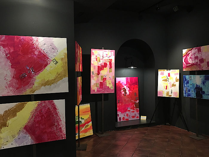 Es gibt die zwei Wochen lang wirklich Unglaubliches zu entdecken, ein vollständiger Spaziergang zu allen Ausstellungsorten lohnt sich wirklich. Im Eiscafé Cristallo beispielsweise hat die Wolfratshauserin Eva Elas mit ihren großflächigen farbigen und teilweise glitzernden Kunstwerken einen geradezu idealen Platz gefunden. Nicht weit entfernt davon in der Parfümerie Wiedemann entzückt ein zarter Frauenrücken im roten Kleid, umhüllt von wolkigem grün-blau – gemalt von Yaya Bela Roth aus Münsing – die Besucher vor dem Schaufenster. Kunstwerk an Kunstwerk reiht sich nicht nur den ganzen Obermarkt entlang, wo im ansonsten leer stehenden Gebäude am Schwankl-Eck gleich mehrere Künstler eine vorübergehende Heimat gefunden haben.