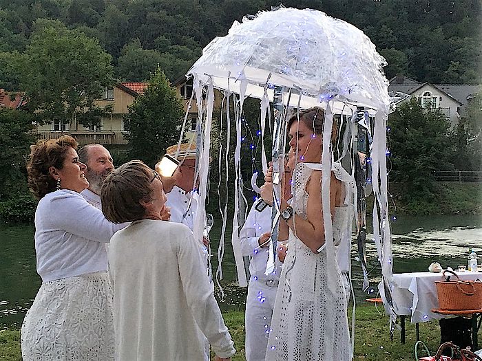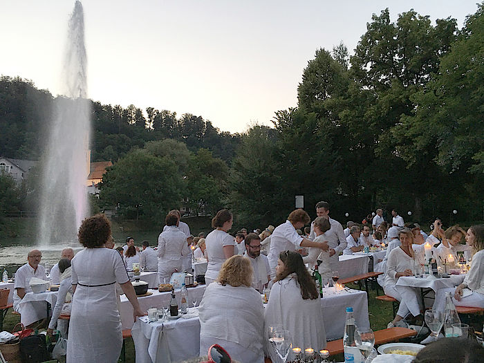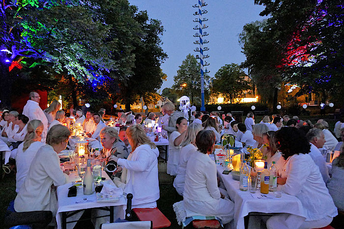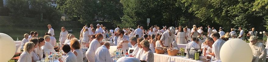 Wolfratshausen, 4.7.2018 – Es war kein spontaner Flashmob an einem schönen Platz, wie in München, der sich spontan formiert und sich wieder auflöst. Das „White Dinner“ gibt es seit acht Jahren in der Landeshauptstadt, ohne offizielle Erlaubnis, um friedlich auf die Genehmigungspflicht von Straßenfesten hinzuweisen. Das erste „Dinner en Blanc“ an der alten Floßlände zog rund 400 Teilnehmer aus dem ganzen Umland an. Ganz in weiß wurde mit Stil und Eleganz am Loisachufer gespeist. Dr. Peter Wegele, Musiklehrer an der Musikschule Geretsried, unterhielt die Besucher mit Swing am Klavier.