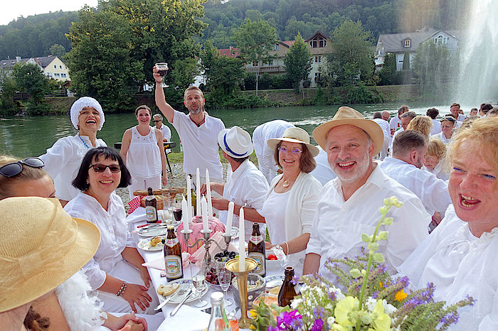 Alle anderen waren überpünktlich. Sie hatten Picknickkörbe mitgebracht und deckten stilvoll ihre reservierten Tische, die sich im Halbkreis an den Uferhang schmiegten. Weiße Kerzen, weiße Rosen, weißes Geschirr. Farbe kam an diesem Abend nicht auf den Tisch, nur als buntes Lichtspiel in die Bäume. Dafür hatte der Kulturreferent im Kaftan gesorgt. „Kann es einen schöneren Ort geben, als auf einer Wiese zwischen Wasser und Wald?“, schwärmte indes Altbürgermeisterin von Geretsried, Cornelia Irmer, die gerade ihren Tisch mediterran mit einer leuchtenden Muschelkette dekorierte. Franz Mentel trägt weißen Stetson. Er kam mit Frau Annelies und Freunden bis aus Lenggries in die Flößerstadt. „Meine Frau hat davon gelesen und sofort reserviert“, sagt sie. Ohne Werbemaßnahmen waren die 50 Tische á acht Personen nach drei Tagen bereits ausgebucht, bestätigte Ingrid Schnaller. Einen davon konnte sich eine Damengruppe aus Wolfratshausen ergattern. Die Damen schlemmten Käse von der Etagere. „Es ist doch herrlich hier“, finden sie unisono. Auch der einheimische Robert Krambacher mit Frau, Schwiegermutter und süditalienischem Freund genoss die Atmosphäre bei edlen Tröpfchen aus klassisch mundgeblasenem Glas. Natürlich gab es Weißwein. Das versteht sich von selbst. Um Punkt 23 Uhr endete der Spuk. Alfred Fraas: „Das könnten wir öfters machen.“