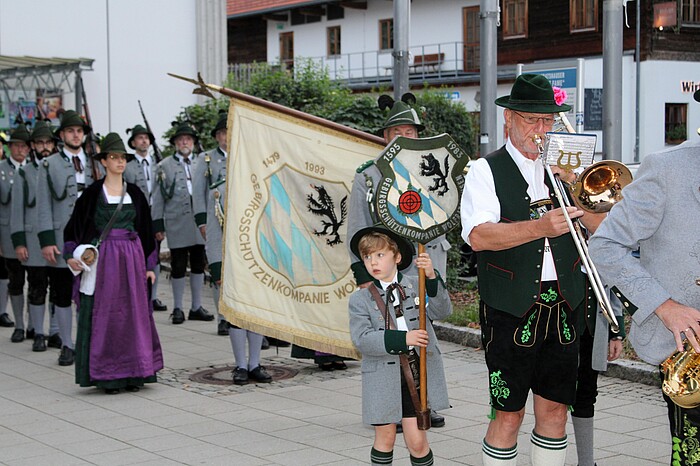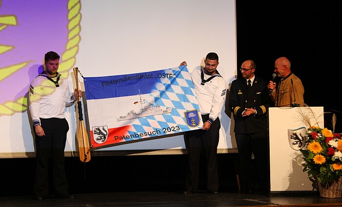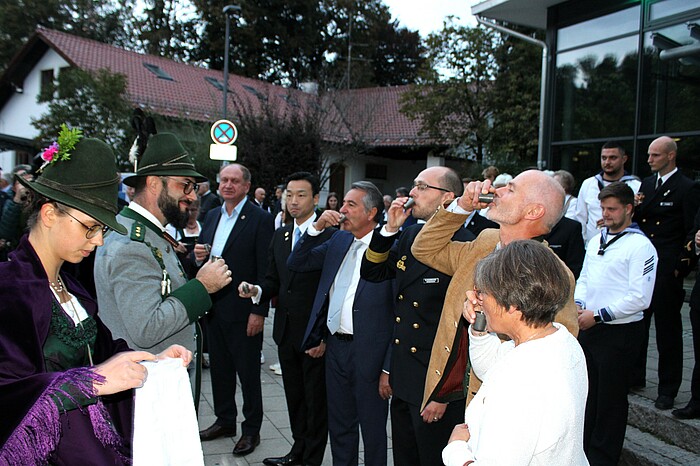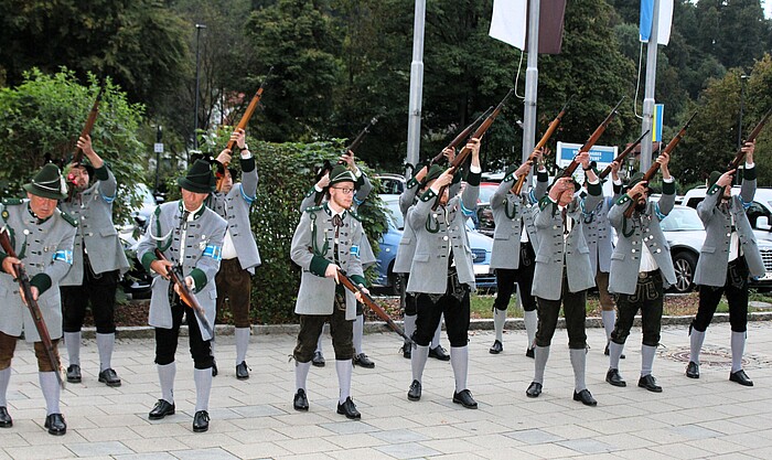 Anlass waren die aufgrund von Corona mehrmals verschobenen Feierlichkeiten zum 50-jährigen Bestehen der deutsch-französischen Städtepartnerschaft mit Barbezieux sowie das 20-jährige Bestehen des Japanischen Gartens und die ebenfalls vor zwei Jahrzehnten gegründete Patenschaft mit dem Flottendienstboot „Oste“. Mit drei Salutschüssen eröffnete die Gebirgsschützenkompanie vor der Loisachhalle die Jubiläumsfeierlichkeiten. Danach zog sie begleitet von den Musikern der Wolfratshauser Stadtkapelle und den verschiedenen Delegationen in den festlich dekorierten Saal ein.
