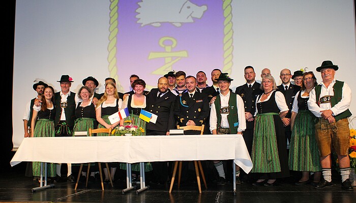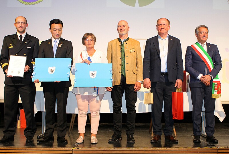 Am Ende des vierstündigen Festabends betrat auch Piero Furlani die Bühne. Der Bürgermeister aus der italienischen Gemeinde Manzano nahm ebenso wie seine Amtskollegen und der Korvettenkapitän Kuhglocken in die Hand. Die Interpretation des „Schneewalzers“ und bekannte Evergreens wie „O sole mio“ brachten die laut applaudierenden Festgäste zum Lachen. Zuvor nahm Ludwig Gollwitzer in seiner Funktion als Vorsitzender des Partnerschaftsvereins Iruma-Wolfratshausen eine Dankesbekundung von Bürgermeister Riichiro Sugishma entgegen. Bürgermeister KLaus Heilinglechner unterzeichnete zusammen mit Vize-Bürgermeisterin Florence Swistek aus Barbezieux und Korvettenkapitan Karsten Bammann erneuerte Partnerschafts-