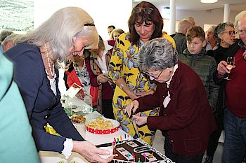 Fortan schrieb Nick sogar Filmmusikschlagertexte für die Schauspielerin Maria Schell und Hans Albers. „Als ich ihn in den Studios am Geiselgasteig bei München traf, begrüßte er mich mit den Worten: ,Das also ist das Fräulein Goethe` “, erinnerte sie sich. Dem Literaturnobelpreisträger Heinrich Böll begegnete Nick einst in Köln. „Er hatte eine bewundernswerte menschliche Stärke“, lobte sie. Weniger erfreulich war ihre Fahrt nach Bergen-Belsen im Jahr 1954. „Neun Jahre nach Kriegsende wurde dieser Ort bewusst vergessen und verleugnet: Niemand im Ort wollte etwas von den Massengräbern und dem Konzentrationslager gewusst haben“, zeigte sich Nick verwundert. Ihr bewegendes Gedicht „Belsen 1954“ ließ den Besuchern des Badehauses das Blut in den Adern gefrieren. Nach ihren rund einstündigen Ausführungen hatte die ausgebildete Graphologin dann die Ehre, die Badehaus-Geburtstagstorte anzuschneiden. Gemeinsam mit den Besuchern genoss sie das einzigartige Ambiente am Erinnerungsort.