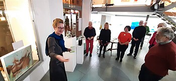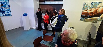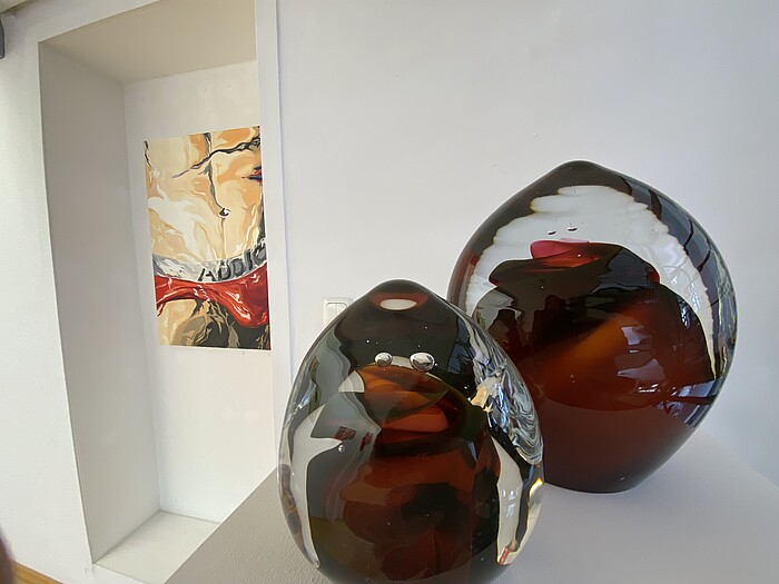 Schriftstellerin und Expertin für traumasensible Beratung Stephanie Fischer nahm die Gäste zu Beginn wieder mit auf das bewusste Einlassen zweier Arbeiten der Künstler. Ein gegossenes Glasobjekt mit einer rostigen Kette von Ursula-Maren Fitz. Es ist eine fließende Form, die in der Bewegung nach oben strebt, gehalten oder gefangen von einer archaischen, verrosteten Kette mit Vorhangschloss. Erst nach und nach entstehen Gedanken, erst nach und nach kommen Bilder in den Sinn, bei jedem andere, entsprechend seiner Lebenssituation. So auch vor dem großformatigen Ölbild von Heinz Stoewer. Ein maskuliner Typ schwimmt kraulend über eine kräuselnde Wasseroberfläche in den hellblauen Farben eines von der Sonne beleuchteten Pools. Doch neben ihm wabert ein dunkles Loch, das in die Tiefe führt. Oder ist das doch nur der Schatten des Schwimmers? Jeder findet seinen eigenen Dialog, ganz für sich allein ohne Interpretationen führen zu müssen. „Das ist, was ich mit meinen Bildern bewirken möchte. Jeder empfindet anders, jeder entdeckt anders“, erklärte Stoewer anschließend im Gespräch.