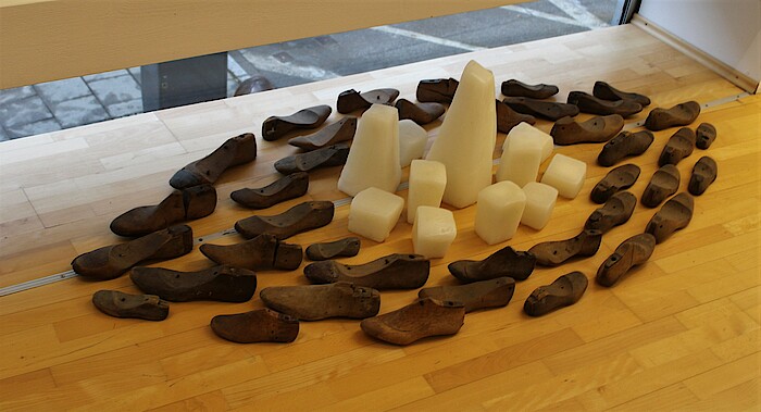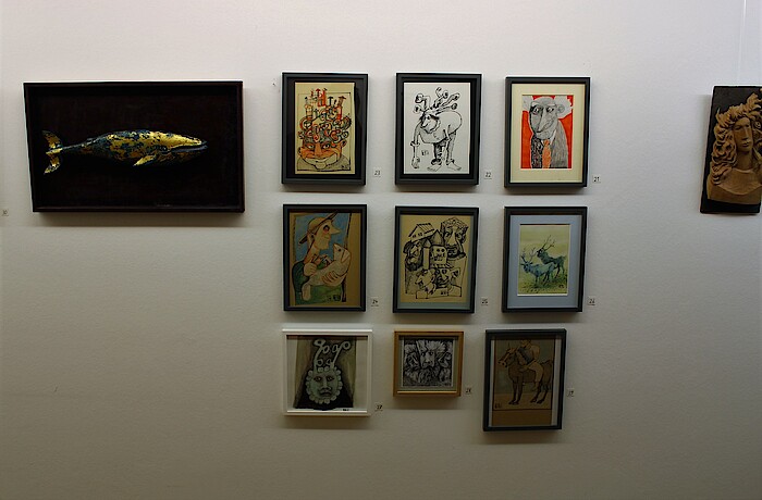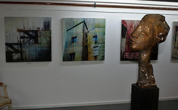 Einen anderen künstlerischen Ansatz verfolgt die Ickingerin Petra Jakob, die durch die Beteiligung an den Ateliertagen in Berg und Icking bekannt wurde. Ihre Photomorphosen sind auf Pergamentpapier gedruckte Fotografien, aufgezogen auf Holzkörper oder Leinwand. „Die Zerlegung des Gesamtbilds in ein Raster, dessen Teile einzeln bearbeitet werden, digitale Belichtungs- und Farbverschiebung, Verwaschung und die dadurch entstandene strukturierte Oberfläche führen zur Verfremdung und beeinflussen den subjektiven Blick auf das Motiv“, beschreibt Jakob ihre Vorgehensweise. Die Verschmelzung der beiden Abbildungsformen Fotografie und Malerei ist auf Werken wie „Stufen“, „Tierleben“ oder „Windschief“ gut zu erkennen. Zur Vielfalt der Ausstellung tragen nicht zuletzt auch die Zeichnungen von Teresa Erhart bei. Ein Selbstporträt zeigt sie mit Stift und Papier am Schreibtisch sitzend. „Tatsächlich zeichne und schnitze ich seit Kindertagen mit nicht nachlassender Freude“, erzählte die Wolfratshauserin.